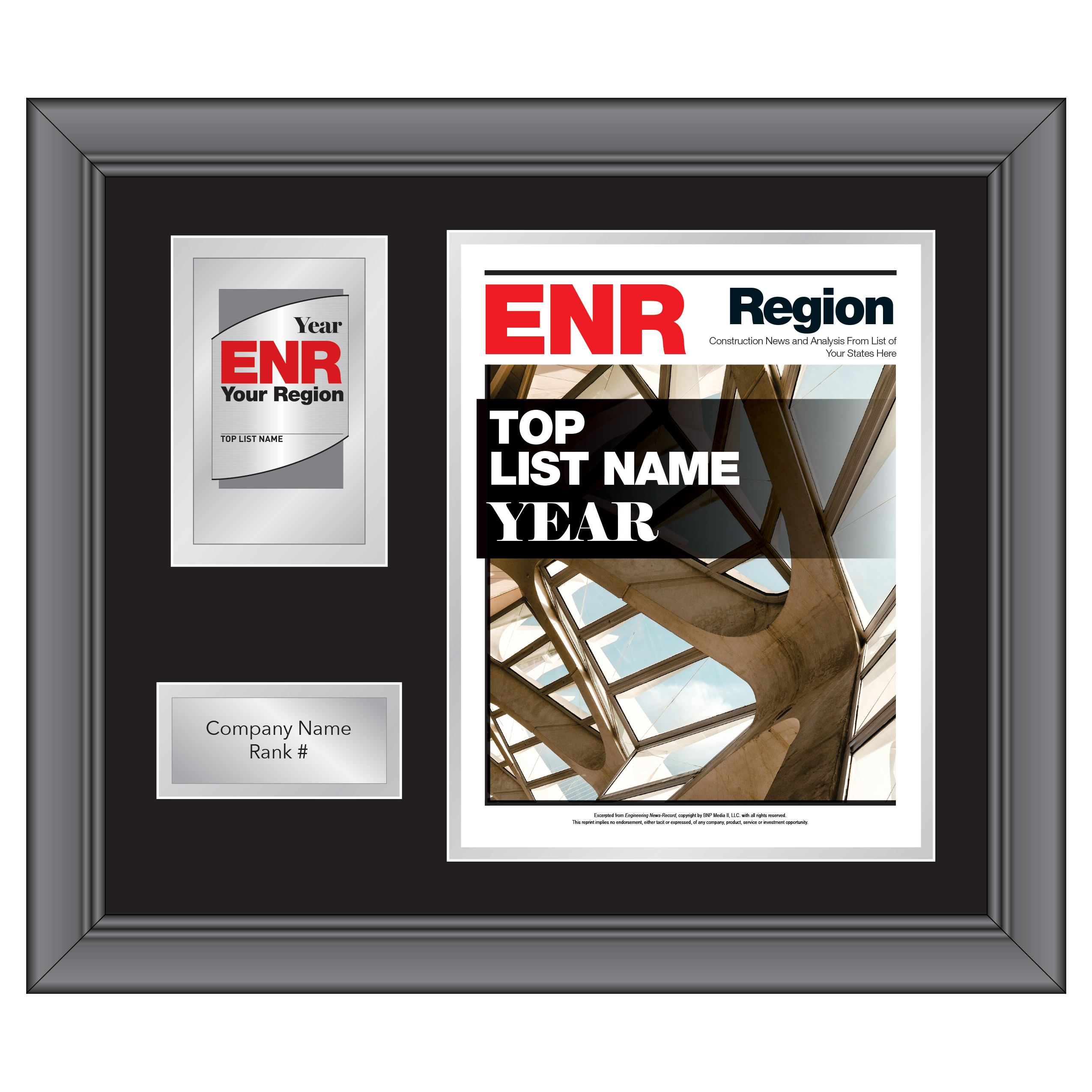 Includes a single-page layout showcasing your award list and includes a plate for customization and the ENR Regional Award List logo. Available in a black frame with silver accents.